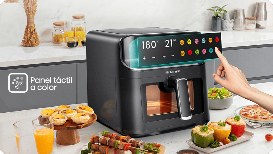La Airfryer H06AFBS2S3 de Hisense combina tecnología de cocción saludable con diseño moderno y funcional. Gracias a su capacidad de 6.7 litros y sistema de circulación de aire caliente a 360°, su gran ventana visible con luz interna permite monitorear la cocción sin abrir la cesta, mientras que su pantalla táctil colorida facilita el control de temperatura (entre 80°C y 200°C) y tiempo.