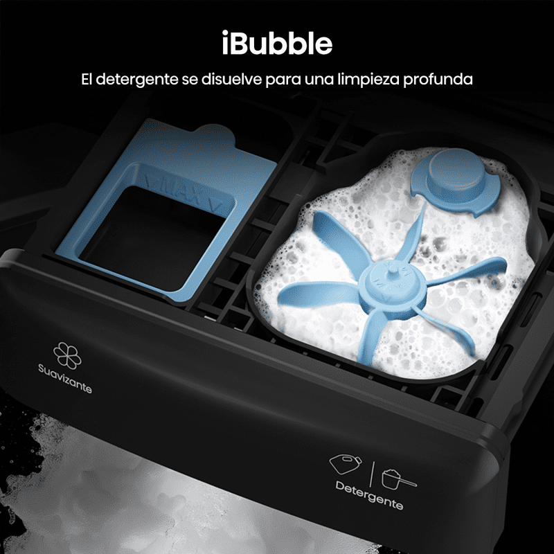 Un remolino antihorario disuelve el detergente y crea espuma densa para una limpieza más profunda. Menos residuos, más eficiencia y un dispensador siempre limpio.