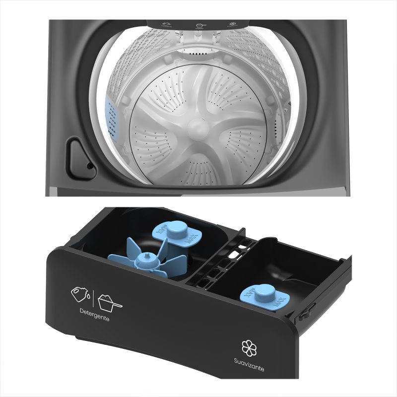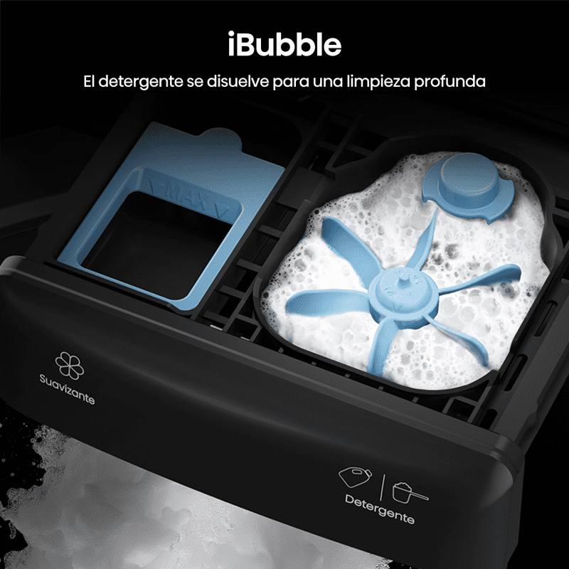 Un remolino antihorario disuelve el detergente y crea espuma densa para una limpieza más profunda. Menos residuos, más eficiencia y un dispensador siempre limpio.