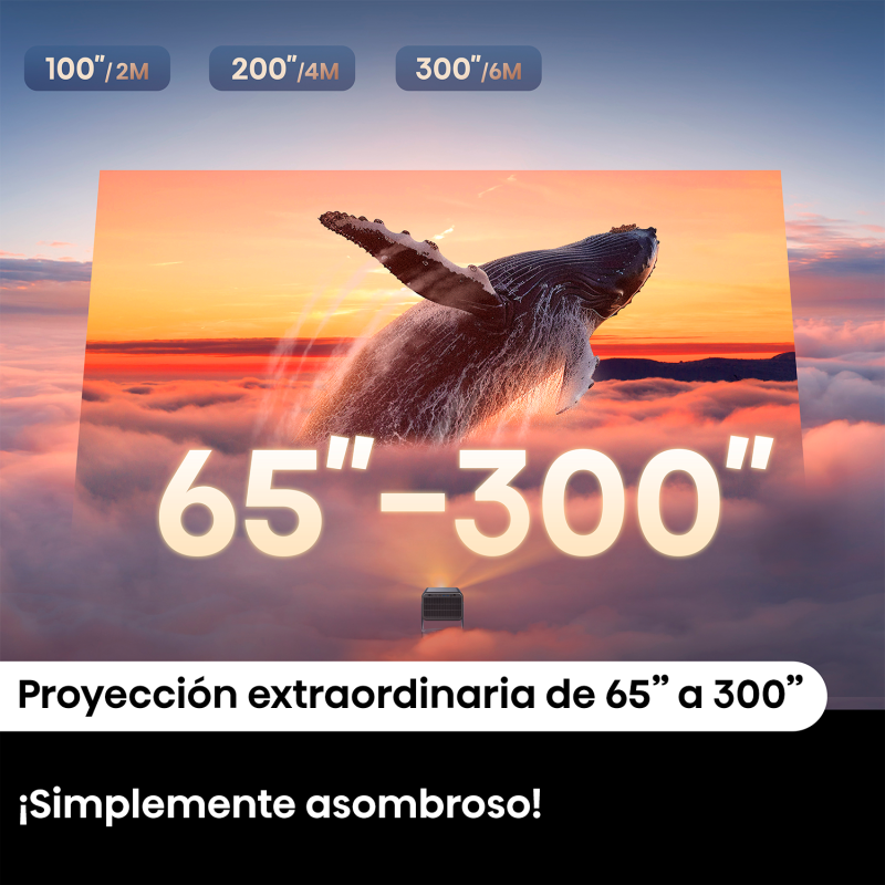 Crea la mejor experiencia de visualización. Este proyector se adapta a cualquier tamaño de pantalla, desde 65” hasta 300”, por lo que puedes proyectar en una pared de tu sala o en una pantalla gigante en tu patio trasero.