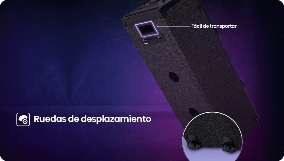 Su diseño con ruedas integradas facilita el traslado a cualquier lugar. La música te acompaña siempre, dentro o fuera de casa sin esfuerzo.