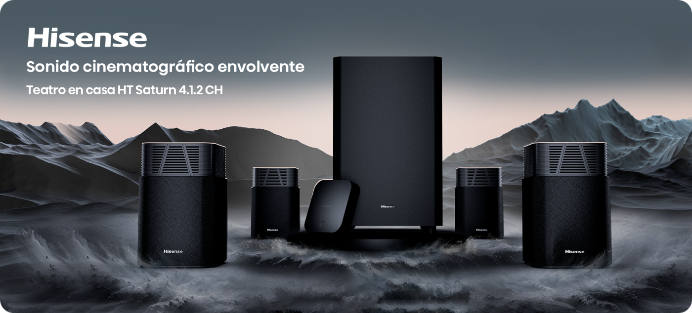 El HT Saturn de Hisense fue premiado como mejor sistema envolvente inalámbrico por EISA 2025–2026 porque logra: sonido de cine real sin cables; sus cuatro parlantes se sincronizan automáticamente. El subwoofer de 6.5" entrega graves que se sienten en todo el cuerpo y la tecnología Dolby Atmos y DTS:X crea una atmósfera sonora que te envuelve desde todos los ángulos, haciéndote sentir incluso mejor que en una sala de cine. El HT Saturn se instala en minutos y transforma cualquier espacio en una experiencia sonora inmersiva, de una forma que aún no has experimentado.