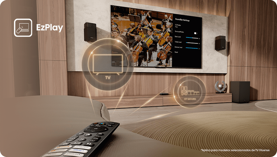 Con EzPlay, ajusta el sonido de tu sistema HT Saturn directamente desde el control de tu televisor Hisense. Sin complicaciones, sin pasos extra. Solo tú, tu contenido y el sonido perfecto para cada escena.