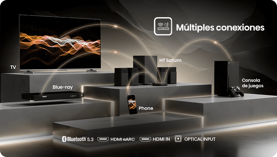 Bluetooth 5.3, HDMI eARC, HDMI IN y entrada óptica te permiten integrar fácilmente todos tus dispositivos. Películas, videojuegos y música en streaming, todo desde un mismo sistema.