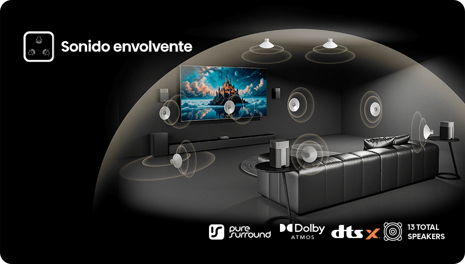 Déjate envolver por un sonido que te transporta. Con 13 altavoces, Pure Surround, Dolby Atmos y DTS:X, cada escena se convierte en una experiencia inmersiva. No estás viendo una película, estás dentro de ella.