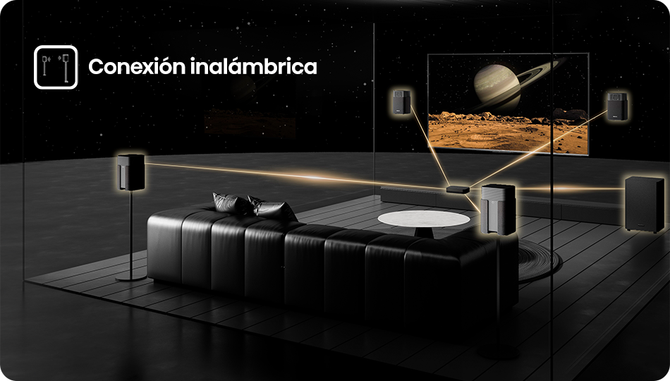 El HT Saturn ajusta su rendimiento según la forma, tamaño y acústica de la habitación para ofrecer una experiencia personalizada. Donde estés sentado, el sonido te envuelve.