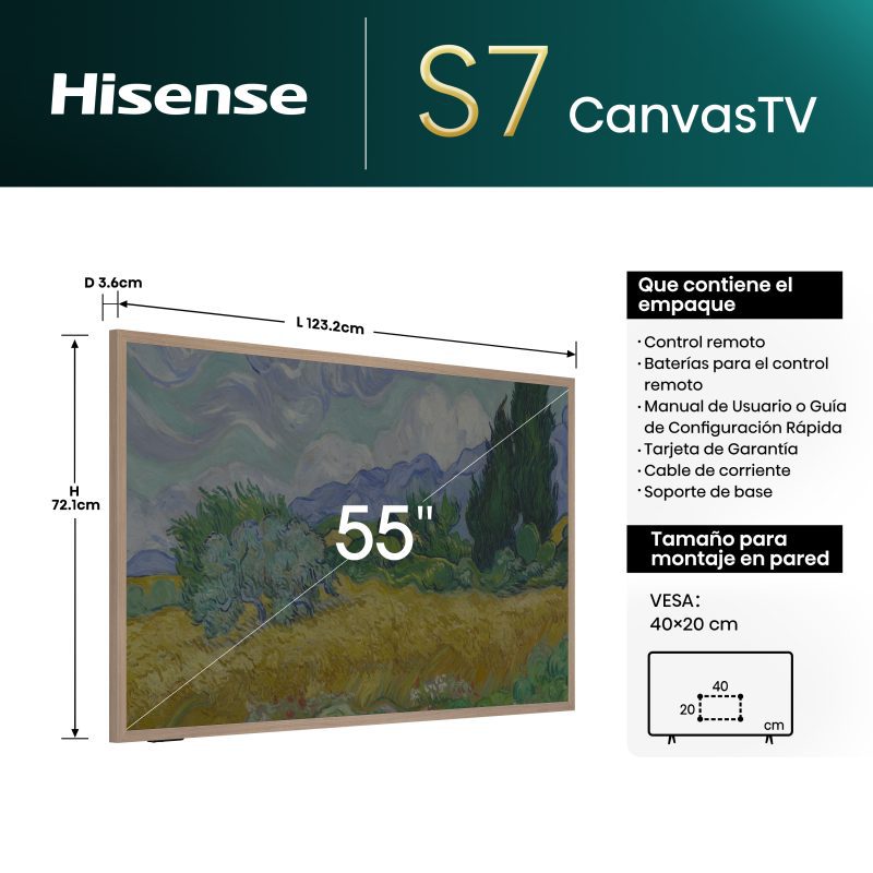 El Hisense Canvas S7 es más que un televisor, es una obra de arte. Con un diseño ultra delgado y funciones avanzadas que lo convierten en el centro de atención de cualquier sala o habitación, el Canvas S7 es el compañero perfecto para aquellos que buscan la mejor calidad visual y, al mismo tiempo, desean integrar el televisor en su espacio de una forma elegante y sofisticada.