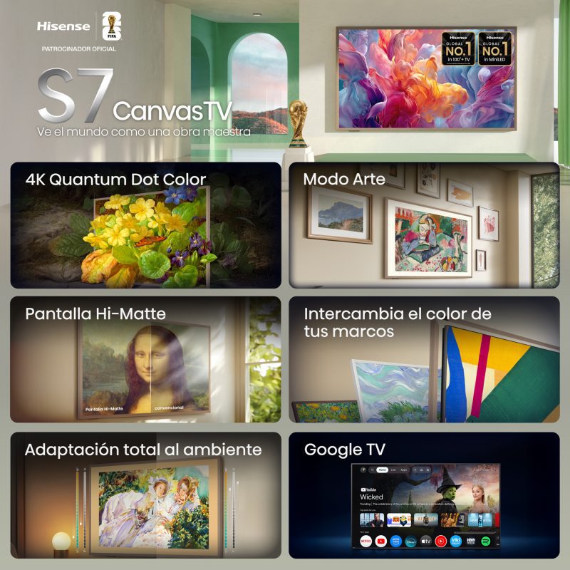 El Hisense Canvas S7 es más que un televisor, es una obra de arte. Con un diseño ultra delgado y funciones avanzadas que lo convierten en el centro de atención de cualquier sala o habitación, el Canvas S7 es el compañero perfecto para aquellos que buscan la mejor calidad visual y, al mismo tiempo, desean integrar el televisor en su espacio de una forma elegante y sofisticada.