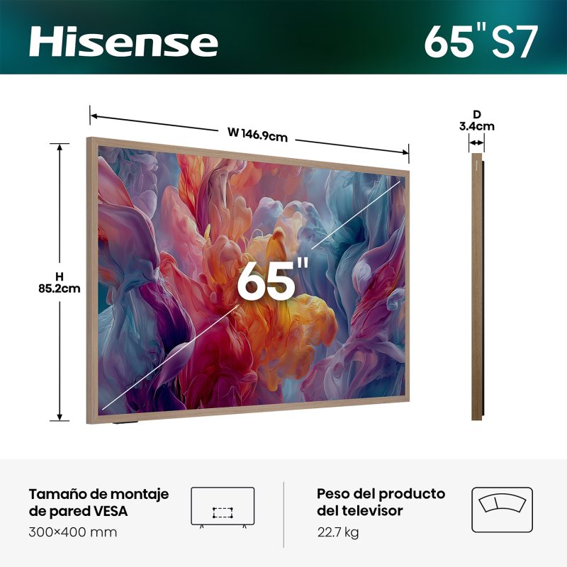 El Hisense Canvas S7 es más que un televisor, es una obra de arte. Con un diseño ultra delgado y funciones avanzadas que lo convierten en el centro de atención de cualquier sala o habitación, el Canvas S7 es el compañero perfecto para aquellos que buscan la mejor calidad visual y, al mismo tiempo, desean integrar el televisor en su espacio de una forma elegante y sofisticada.
